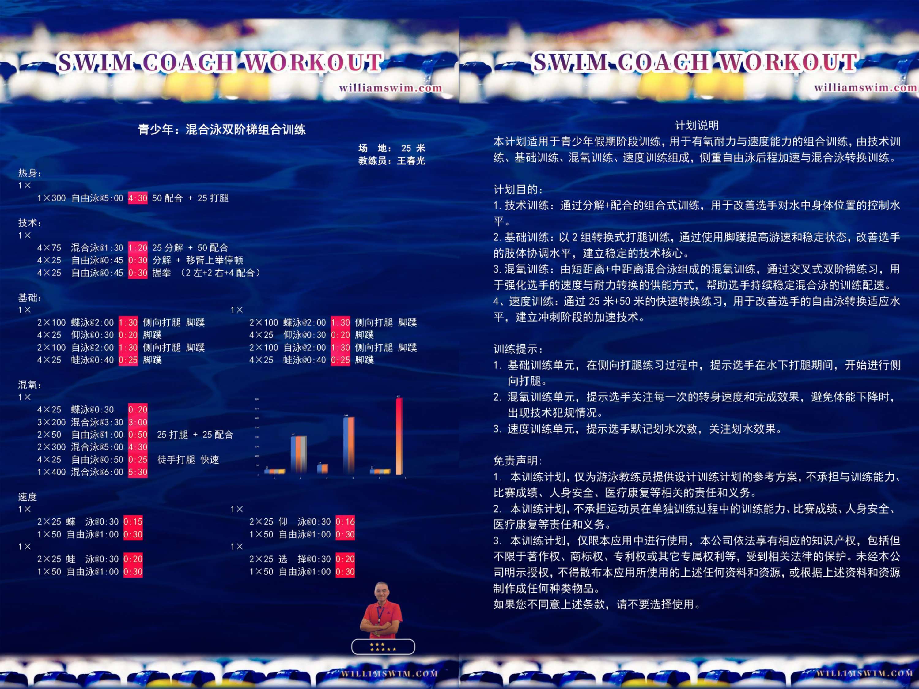 - 本训练计划,仅为游泳教练员提供设计训练计划的参考方案,不承担与训练能力、比赛成绩、人身安全、医疗康复等相关的责任和义务。
